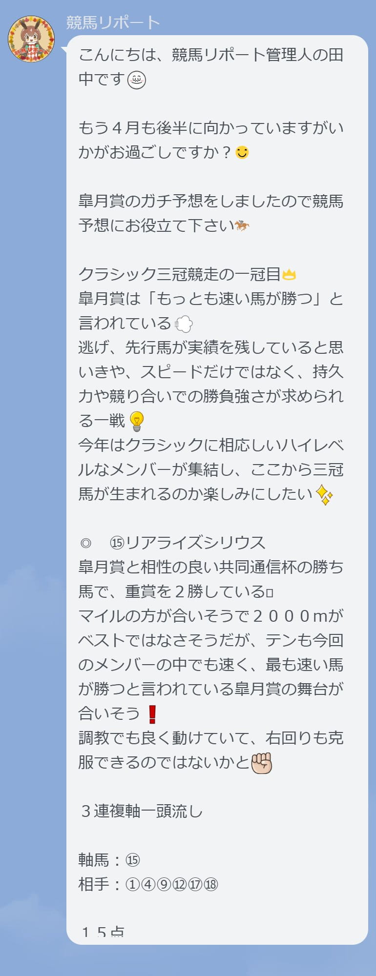 こんにちは、競馬リポート管理人の田中です。