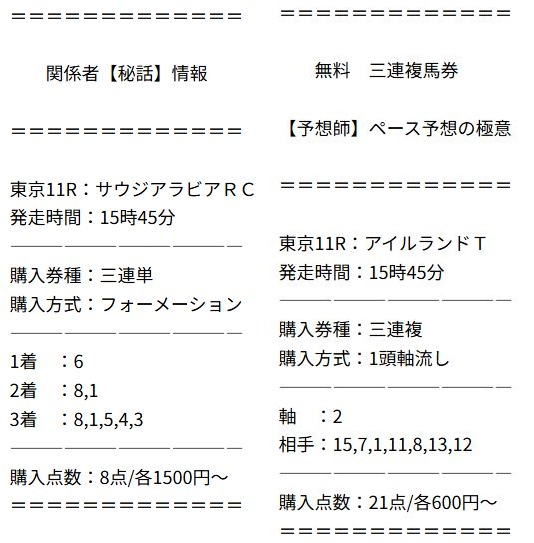 素人なりに画像編集してみました、日曜日の2鞍分の無料情報公開買い目になります。