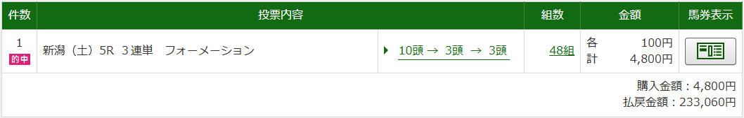 今回の結果は回収率4647%、馬券代差し引いての利益21万8260円という素晴らしい結果でした。